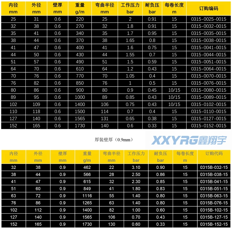 內徑 | 重量 | 工作壓力 | 耐負壓 | 彎曲半徑 | 每卷長度(dù) | 訂購編碼 |