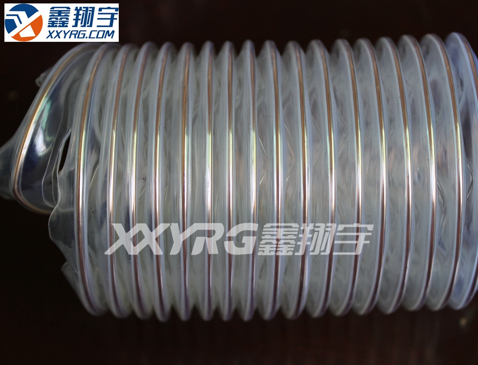顏色(sè):透(tòu)明PU管壁,帶鍍銅色包塑鋼絲螺旋加強